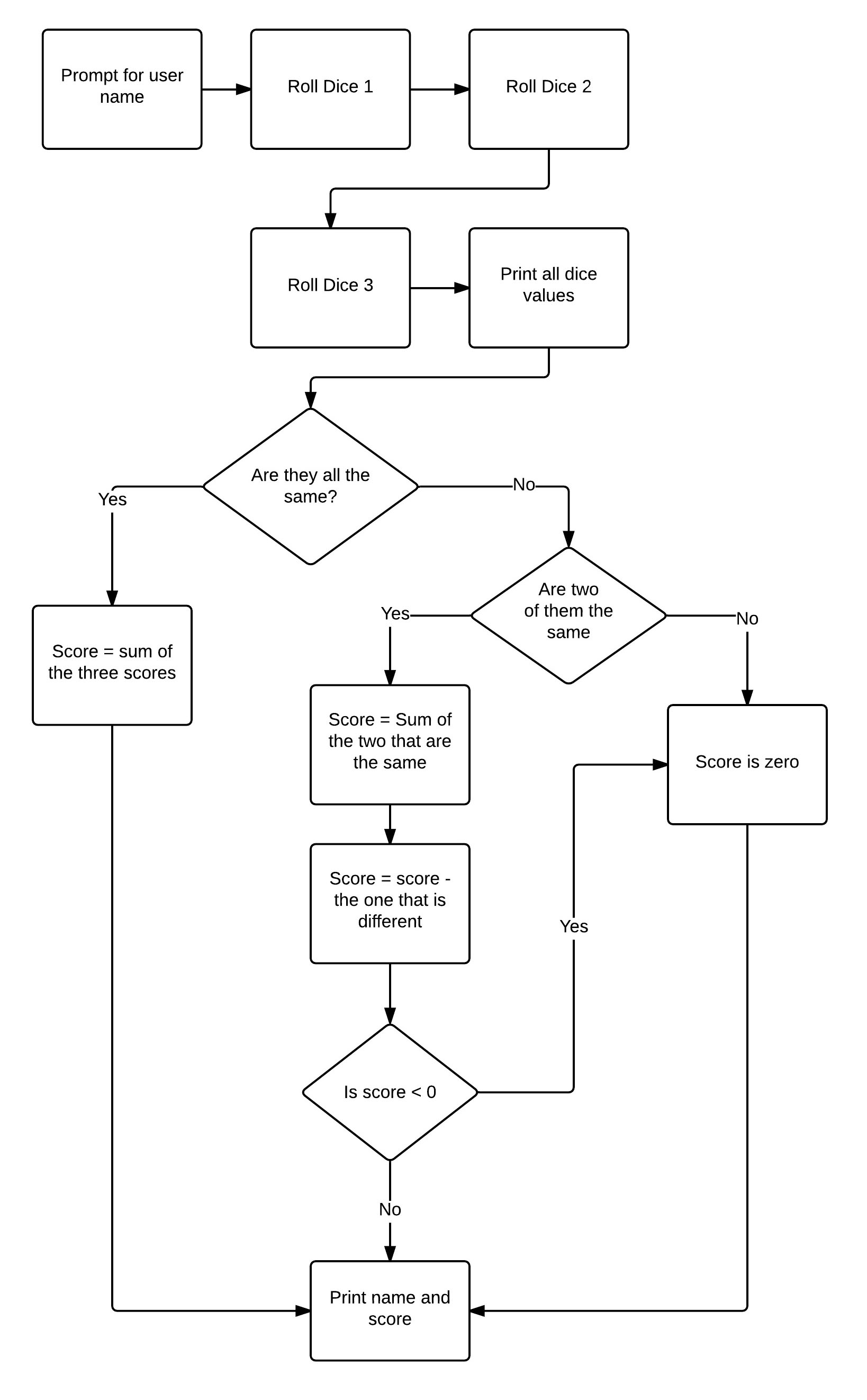 Dice GameThe flowchart describes a game in which a player rolls three standard dice and then gets a score based on how many of the dice are showing the same number.