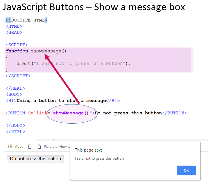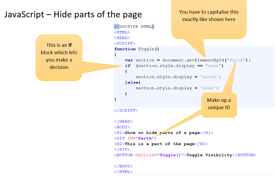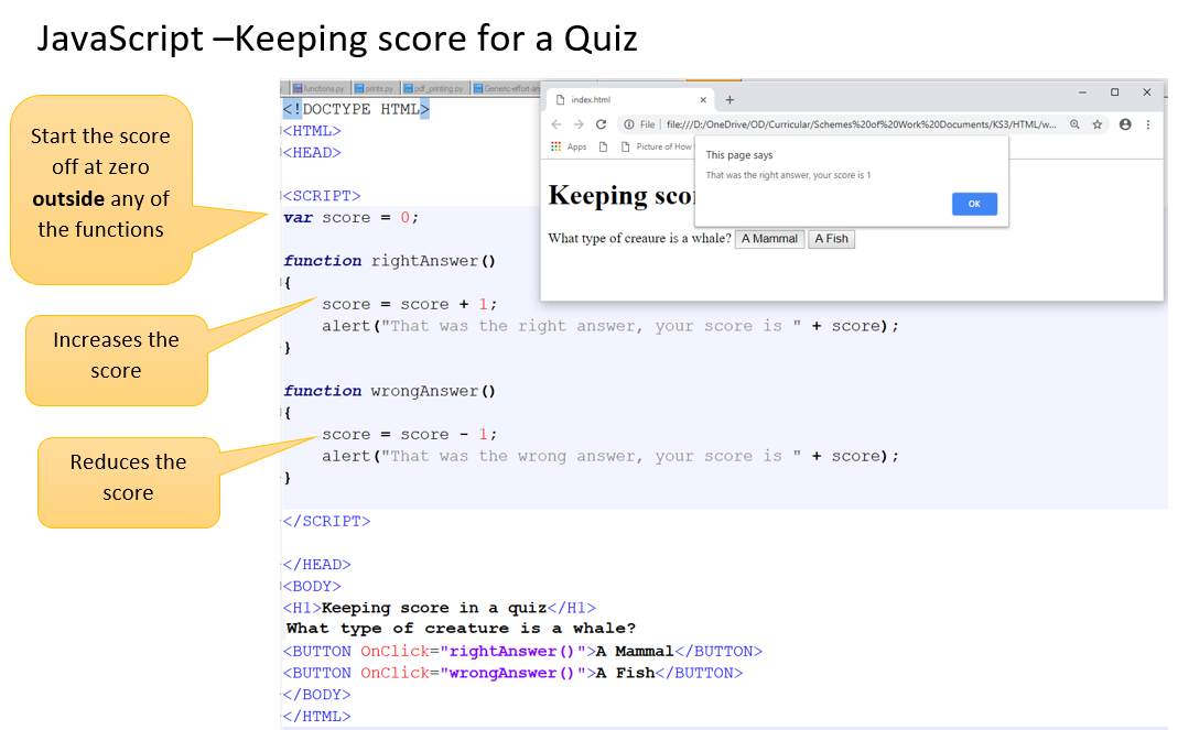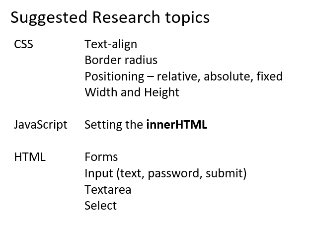 Getting StartedBasic HTML tagsImagesBasic TablesAdvanced TablesLinksCSSCSS classesJavaScript Buttons - Show a message boxJavaScript - Keeping score for a QuizJavaScript - Hide parts of the pageSuggested Research topicsLearn about SVG images |