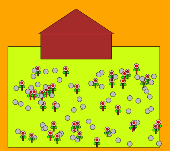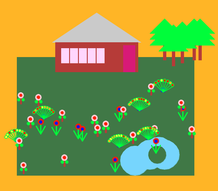 The code for this program draws a garden, with subroutines that draw flowers, a lawn and a shed, and using randomness to position the flowers. Some aspects are not finished off, so pupils have to adapt some of the subroutines, and also to add others of their own. The final extension, putting in a pond and stopping the flowers appearing in the water, is quite challenging.